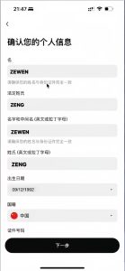 确认个人信息,把中文的改为和你护照上的英文姓名一致,这样生成的IBAN就是和护照上的一样,证件号码填写护照的号码,然后下一步: