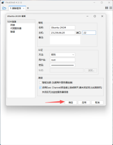 名称随便取一个,主机输入公网ip,端口22不用改(有些vps端口不是),用户名root,密码就是你服务器提供的密码,接着双击创建好的链接,点击接受并保存,就链接成功了。